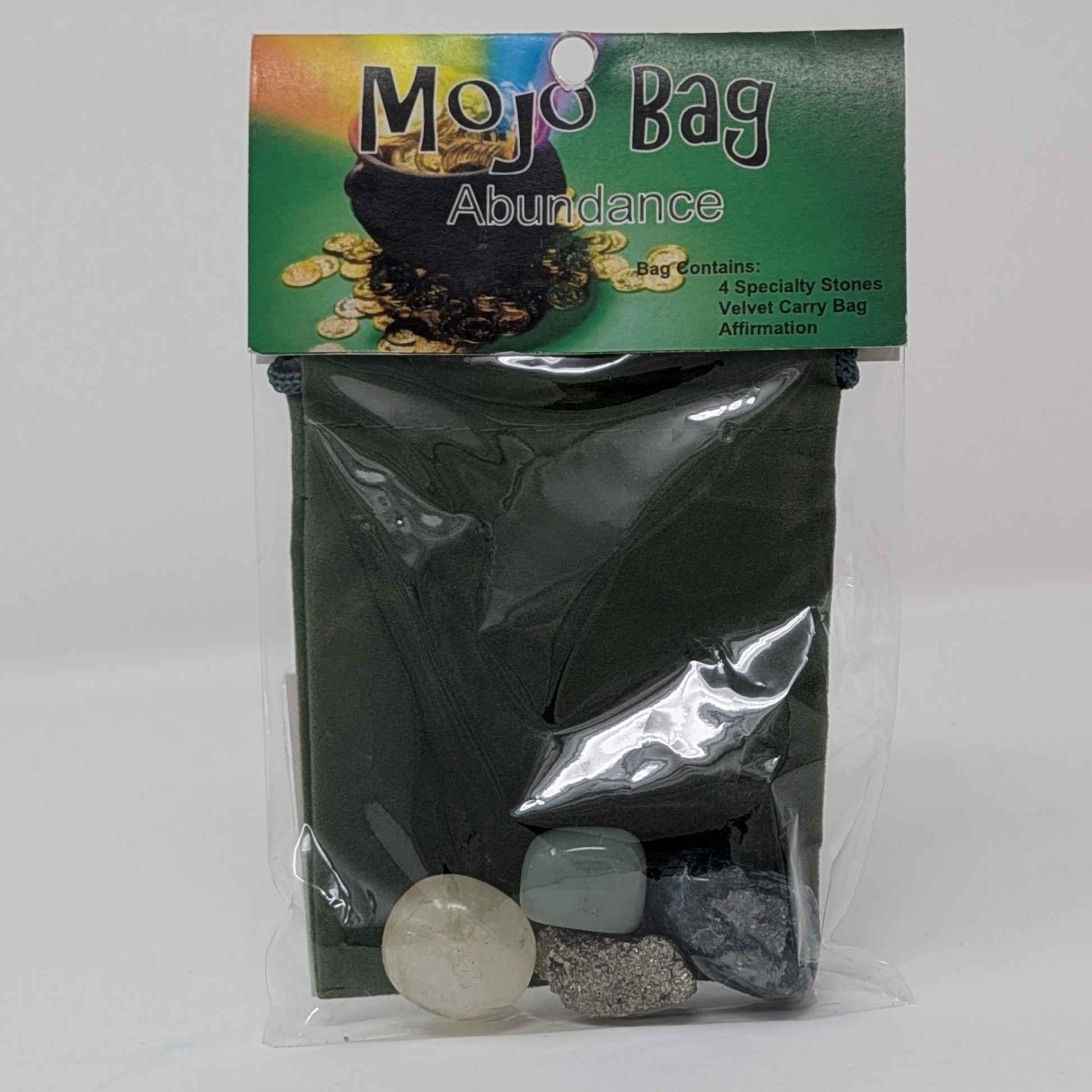Our Mojo Bags are carefully created by our educated staff to help you achieve a specific goal. This bag is especially created to assist with manifesting abundance. It contains Moss Agate, Pyrite, Citrine and Green Aventurine with a color coordinating carrying pouch. This bag contains everything you need - simply read or meditate on the included affirmation each day, keep your crystals close, and watch the magic happen!