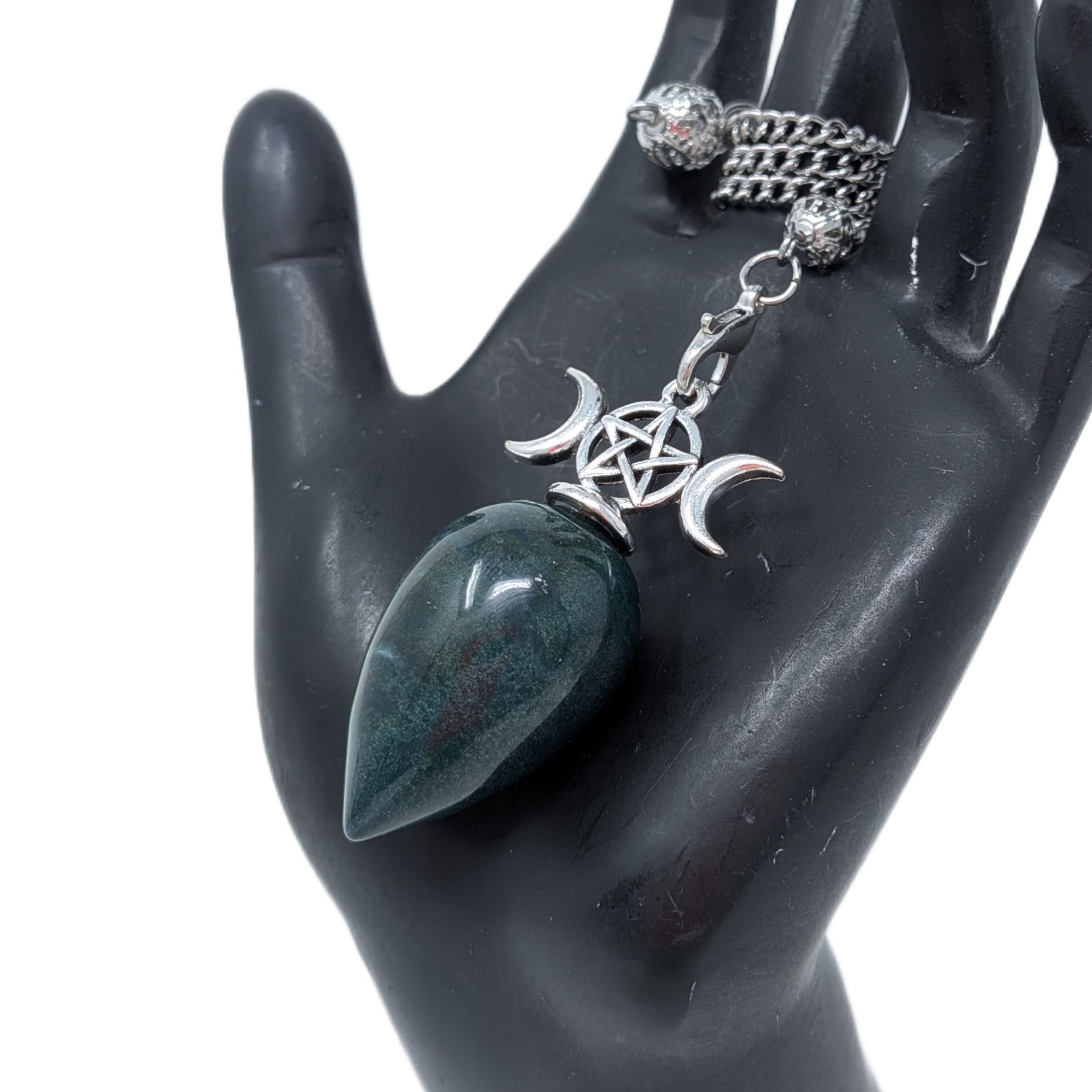 This pendulum features a smooth pendulum carved from ocean jasper topped with a triple moon setting.