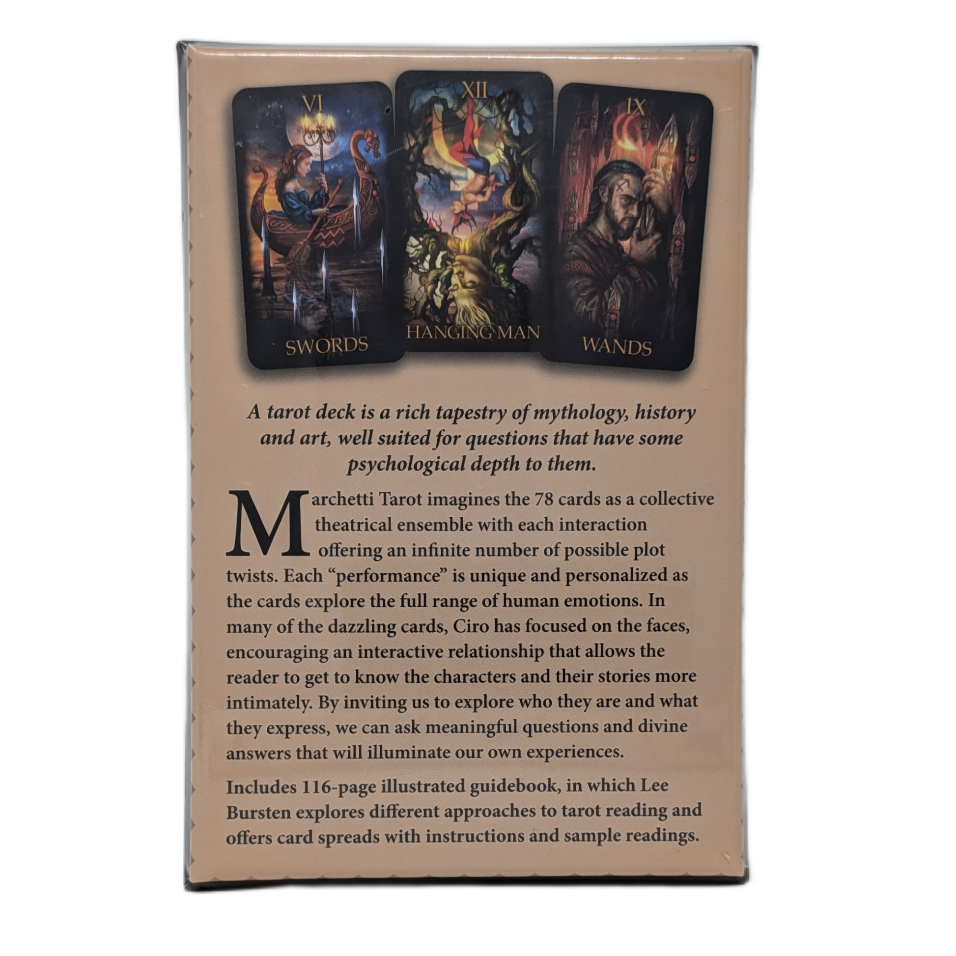 A tarot deck is a rich tapestry of mythology, history and art, well suited for questions that have some psychological depth to them. Marchetti Tarot imagines the 78 cards as a collective theatrical ensemble with each interaction offering an infinite number of possible plot twists. Each “performance” is unique and personalized as the cards explore the full range of human emotions. In many of the dazzling cards, popular digital artist Ciro Marchetti has focused on the faces, encouraging an interactive relationship that allows the reader to get to know the characters and their stories more intimately. By inviting us to explore who they are and what they express, we can ask meaningful questions and divine answers that will illuminate our own experiences.
