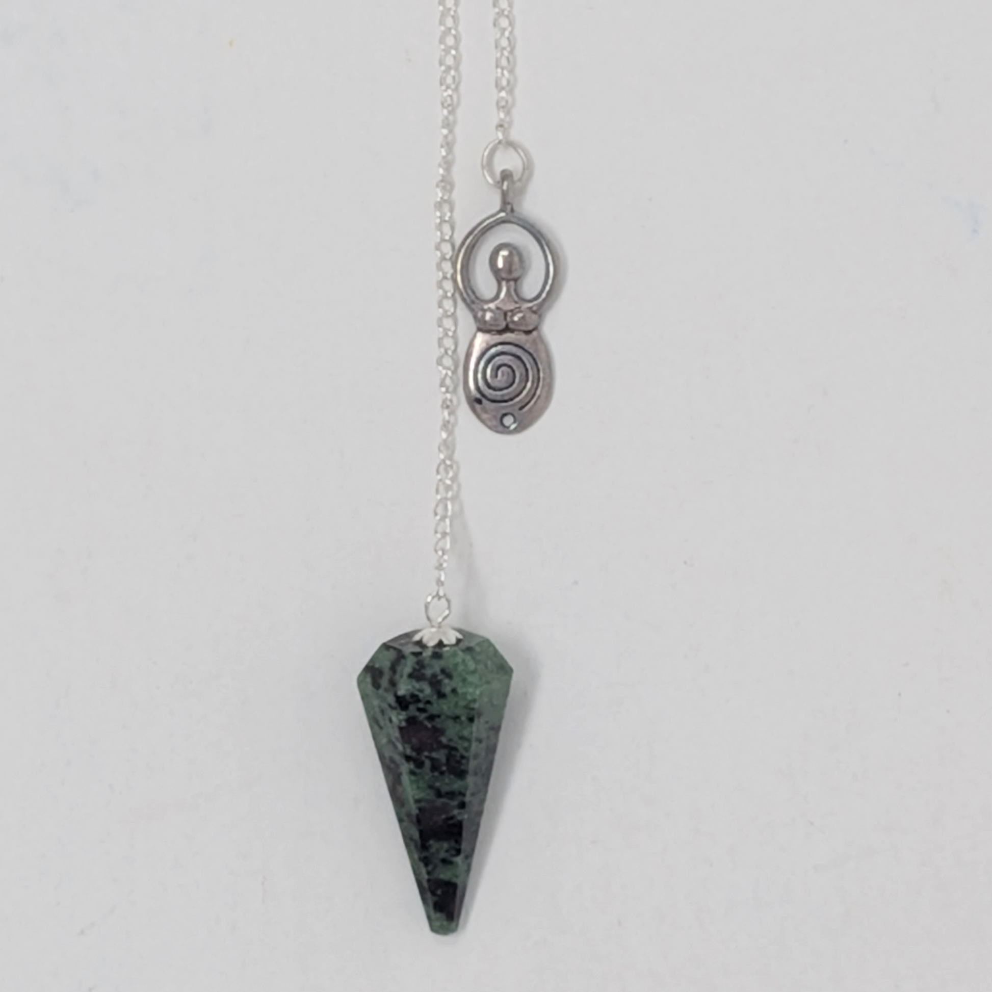 This pendulum is made from Ruby Zoisite and is finished with a spiral goddess charm.
